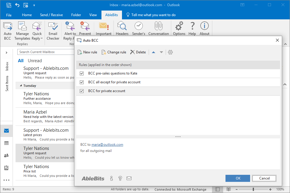 Sending copies of your emails to the same people can be really time-consuming and tiring because you have to enter their addresses to the CC or BCC line in Outlook again and again. Besides, there’s always a risk to forget to copy your boss or colleagues on a really important email. In Add-ins Collection for Outlook you will find a solution that automatically fills CC and BCC fields so that you don’t have to type each person’s email address time after time. Simply create a rule in a few clicks and forget about adding CC or BCC emails. Also, you can always BCC yourself, or the entire distribution list.