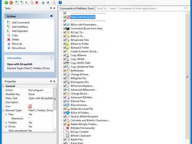 FileMenu Tools mengkonfigurasi item menu konteks Windows Explorer, membolehkan anda mengarang senarai commands yang diperlukan secara bebas. Dengan satu klik, anda boleh menamakan semula, menyalin, mengalih, menghapuskan fail, menjalankan programs yang anda mahu, salin pilihan ke clipboard, menggunakan pengimbas virus, membuka pautan Internet dan banyak lagi. Program ini membolehkan anda menetapkan susunan penempatan item menu, membahagikannya ke dalam kumpulan, mencipta submenu dengan item yang dikehendaki, menggunakan commands dari set yang telah ditetapkan, atau menambah commands anda sendiri dengan parameter tambahan. Satu lagi fitur tersendiri program ini adalah keupayaan untuk menguruskan item menu yang dicipta semasa memasang program lain, serta mengedit cepat menu ‘send’. FileMenu Tools 8.2.2 Full Version.