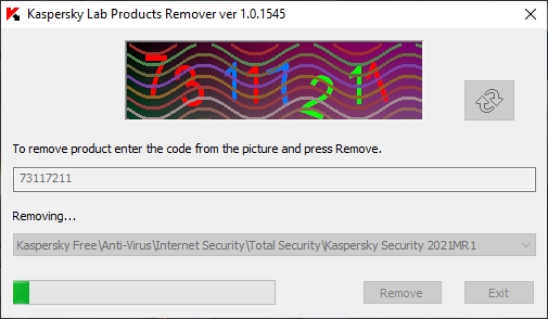 Setelah memilih produk yang diinginkan, anda mesti memasukkan kod keselamatan untuk memulakan proses penyingkiran. Kaspersky Lab Products Remover 1.0.1803.0.