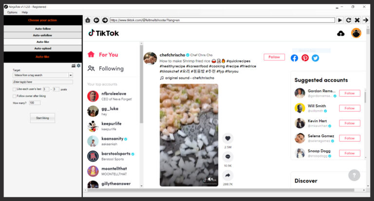 Auto-follow. Ikuti secara besar-besaran pengguna TikTok yang disasarkan dari mana-mana carian tag dalam TikTok atau mengimport senarai tersuai anda sendiri. NinjaTok akan menjadikan anda salah satu tokoh yang paling popular dalam industri atau niche anda. Ia mendapatkan anda avalanche trafik websites yang berkelayakan, pengiktirafan dan pendedahan sekaligus meningkatkan jualan dan keuntungan produk anda secara mendadak. Menjimatkan masa anda YANG TIDAK TERKIRA banyaknya kerana software ini mengautomasikan segala-galanya. NinjaTok 1.2.3.2 Full Version.